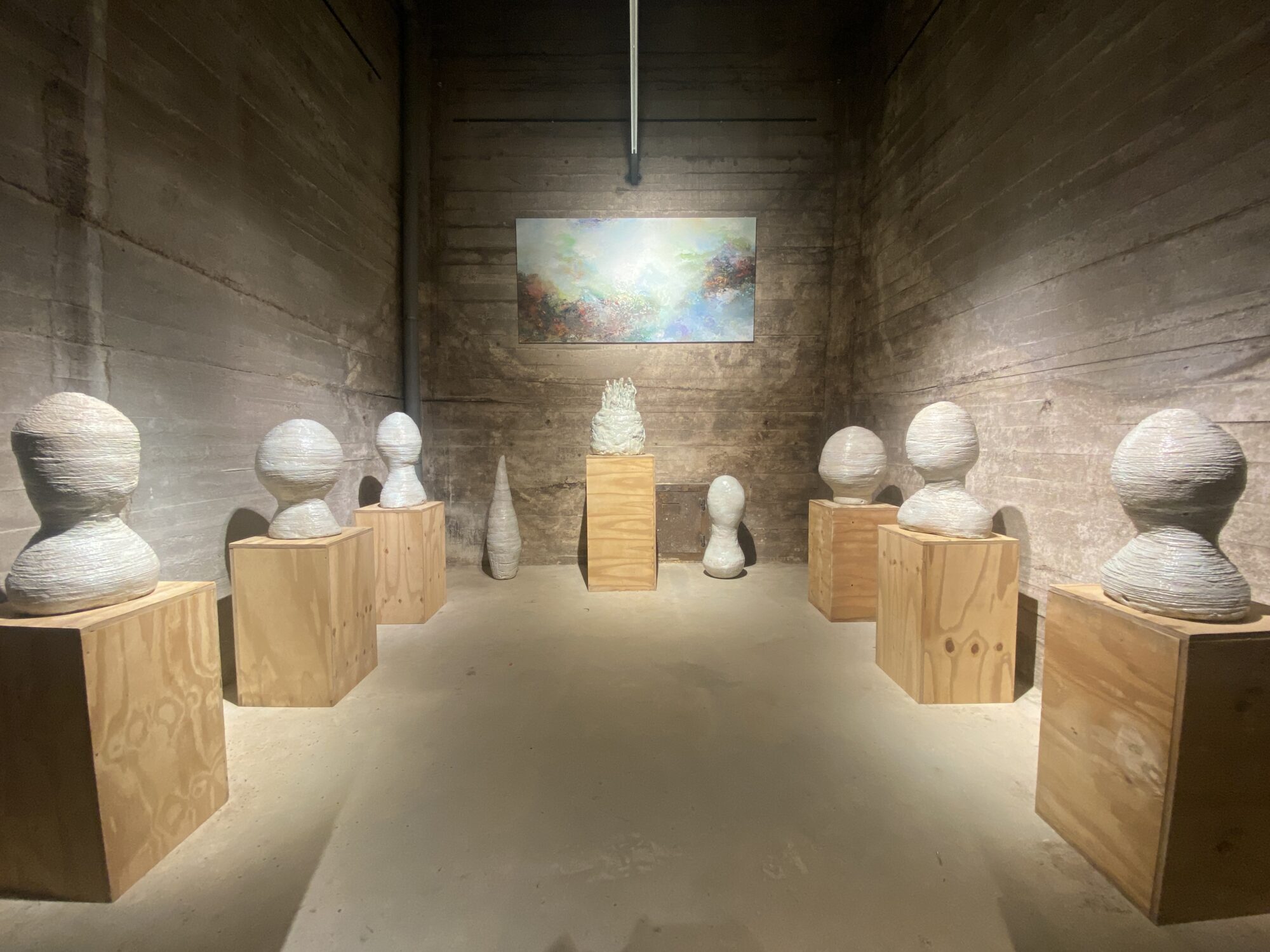 Wat betreft de keramische installatie “Over Entiteit zonder Identiteit”: dit is een beeldengroep die reflecteert op aanwezig zijn, maar zonder bestaansrecht. De vormen van de werken verwijzen naar de vroegst bekende sculpturen van de mens.