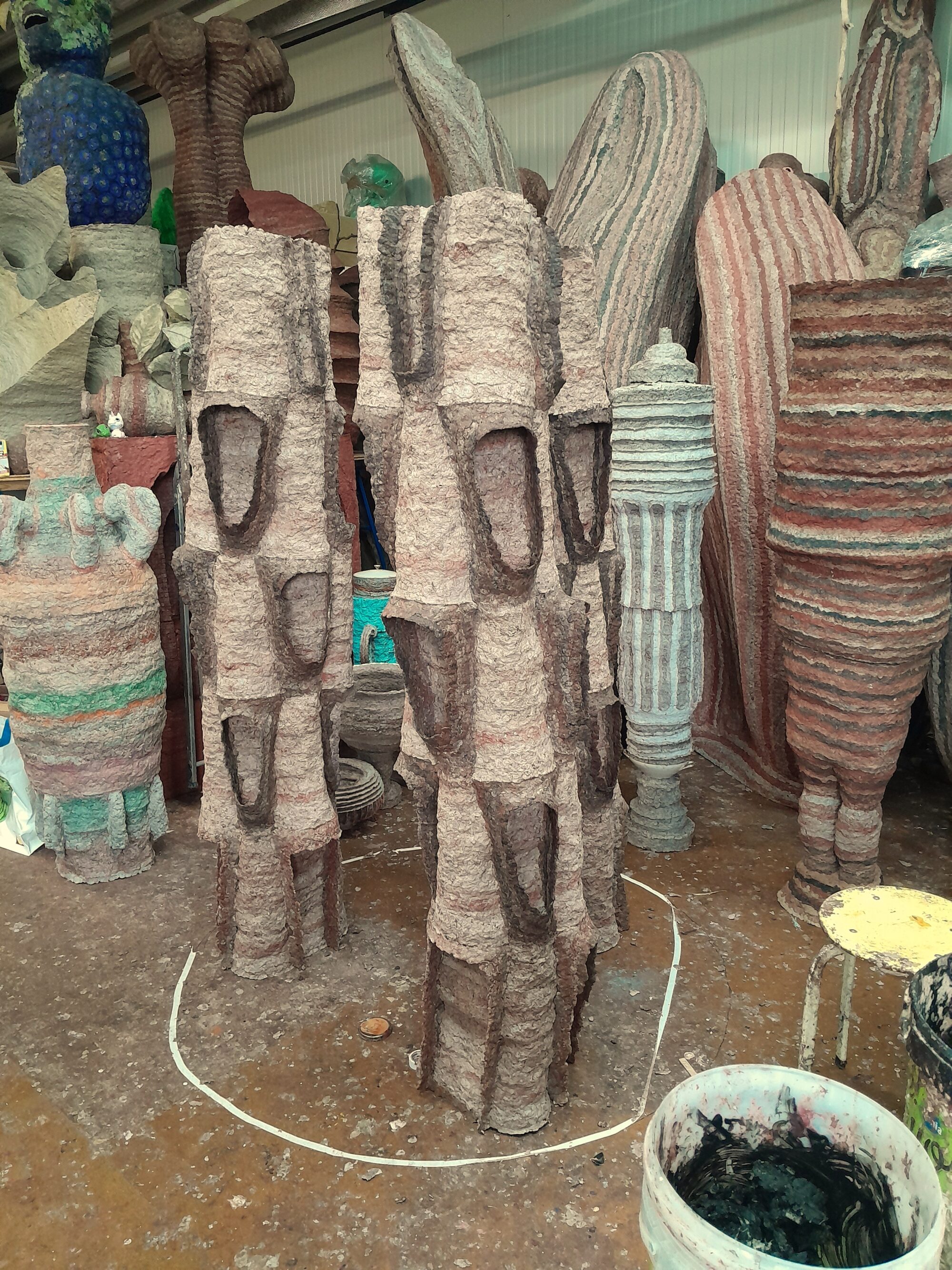 Het gelaagde, tactiele oppervlak doet denken aan geologische processen. Elk element lijkt gevormd door de tijd, alsof het is ontstaan uit opeengestapelde lagen. De geclusterde opstelling creëert een sterk visueel focuspunt dat al van een afstand zichtbaar is, terwijl het de kijker uitnodigt om zich rondom de vormen te bewegen.