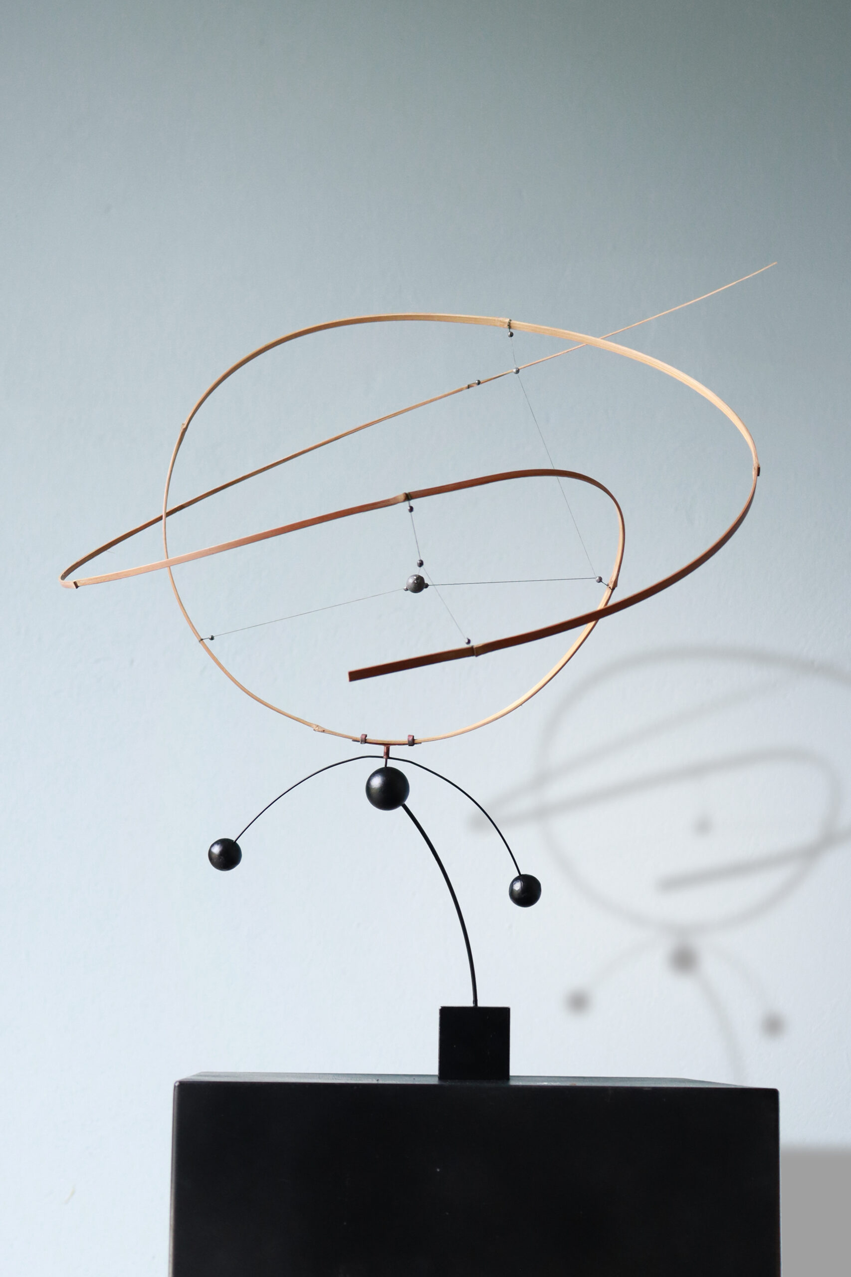 Gerookt bamboe uit Taiwan, titan braid draad, stalen en loden ballen, stalen voet, 2024.