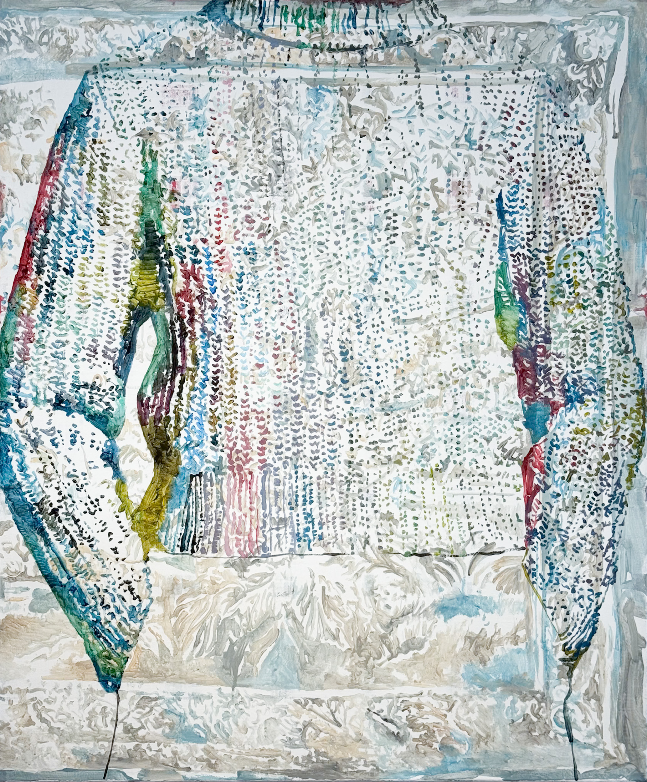 Inkt, spuitverf en olieverf op doek, 2025.